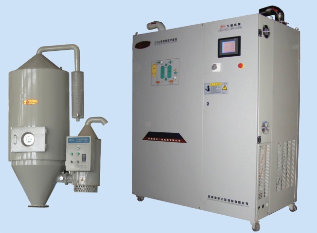 對于吸濕性塑料、傳統(tǒng)的熱風(fēng)干燥方式,僅能去除物料表面的水分和潮氣,對其內(nèi)部的水分無法驅(qū)除。本機利用對水分子有極高吸附作用的分子篩來除濕,將空氣露點降低,再使熱風(fēng)進(jìn)入料斗,此時工作氣流具備塑料干燥的三大要素:流速、溫度和低露點。這股氣流穿過料斗時,不但能使塑料表面水分得以蒸發(fā)并被帶走,而且能去除塑料分子內(nèi)部的結(jié)晶水,達(dá)到降低含水率、快速干燥之目的,同時能使產(chǎn)品成型時保持塑料特性。最終保證塑料加工成型前的要求。